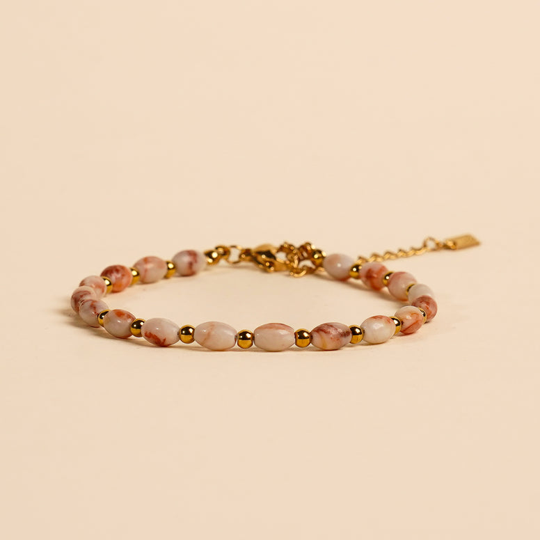Bransoletka wykonana z naturalnego czerwonego jaspisu, osadzona na delikatnym łańcuszku z regulacją, zaprojektowana w lekkiej, biżuteryjnej formie do codziennego noszenia.